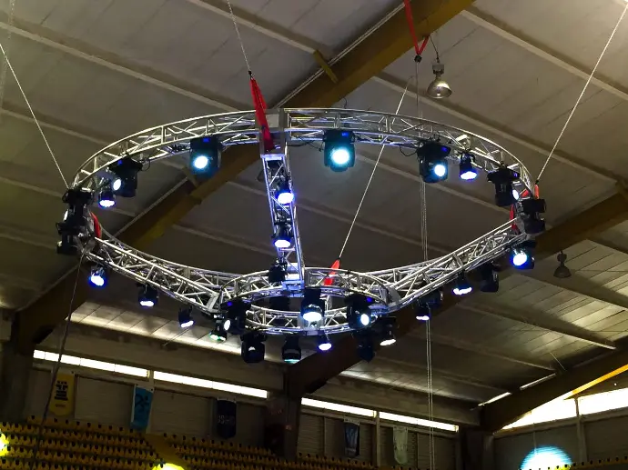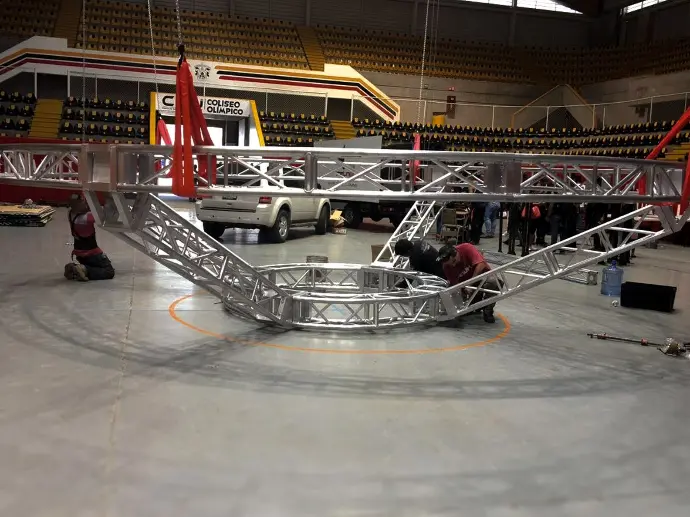 Estructura circular de aluminio diseñada para montaje aéreo de iluminación, audio y producción escénica. Ideal para escenarios 360°, conciertos y eventos corporativos donde la presencia visual y la estabilidad estructural son fundamentales.