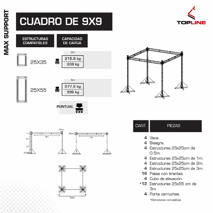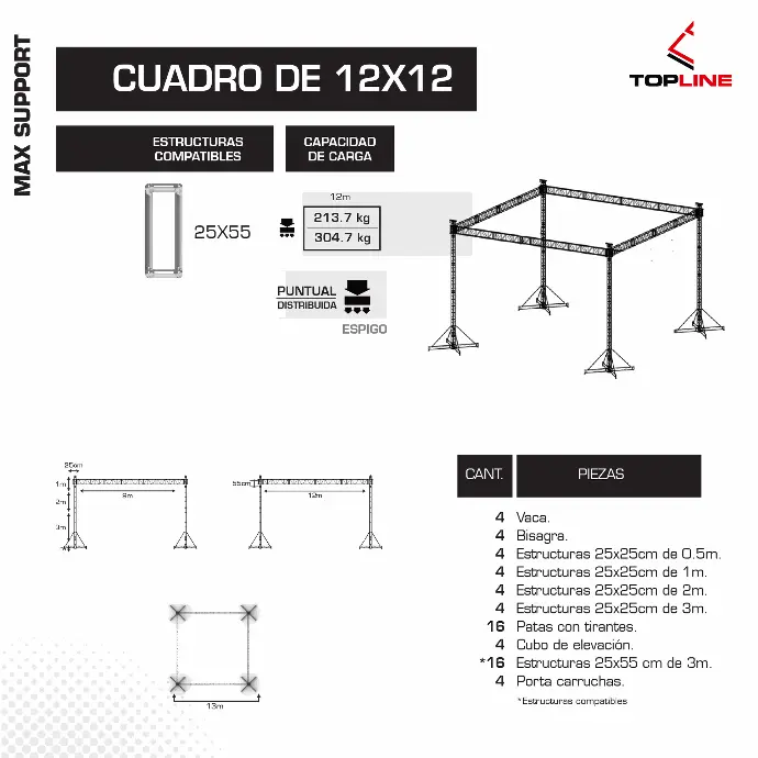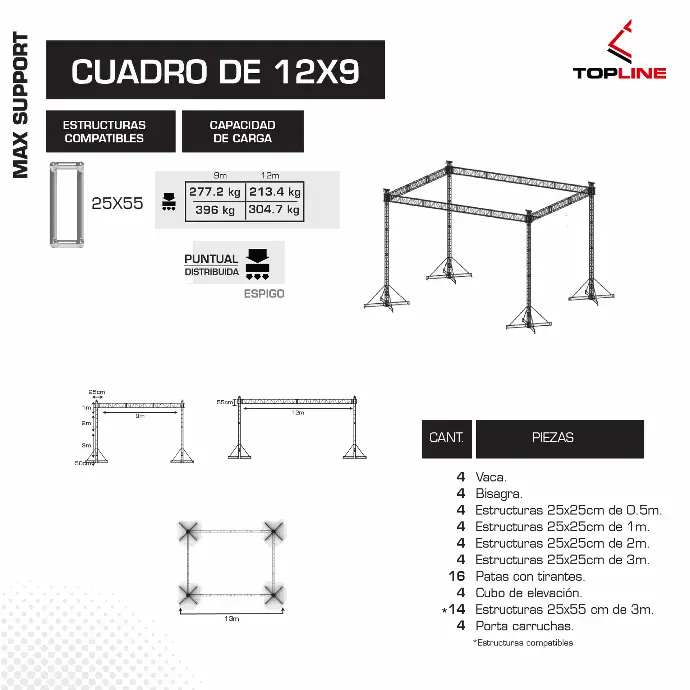 Fabricado con perfiles de 2" calibre 16 y módulos de 25 × 25 cm ensamblados con espigos, combina rigidez y flexibilidad para producciones itinerantes